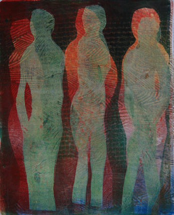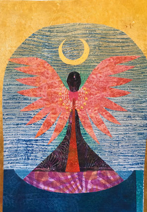 I use my handprinted papers in the collages and am drawn to creating color gradations and textured backgrounds which serve so well in the collaging together of shapes to create a narrative. Each series of collages reflect a time, place or particular life experience. “The Chakana” series was created in 2018. The Chakana or Quechuan cross appeared to me while in the hospital in Ambato, Ecuador and carried me through a vulnerable and uncertain time. "Day dreaming” arose from a trip I took to Scotland and “The Ancestor” series arrived 2 weeks before my husband suddenly passed away. The process feels very devotional and each piece holds a great depth of insight and a kind of prescient awareness.