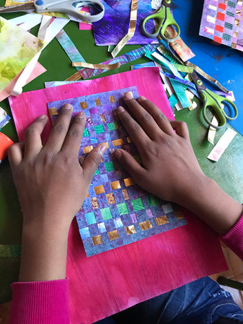 2 of the projects we completed in Pelileo were collaborative. We made prayer flags to hang in the classroom as well as a wall piece in which each student made a 6”x6”: square using cray-pas resist painting, collage and drawing.